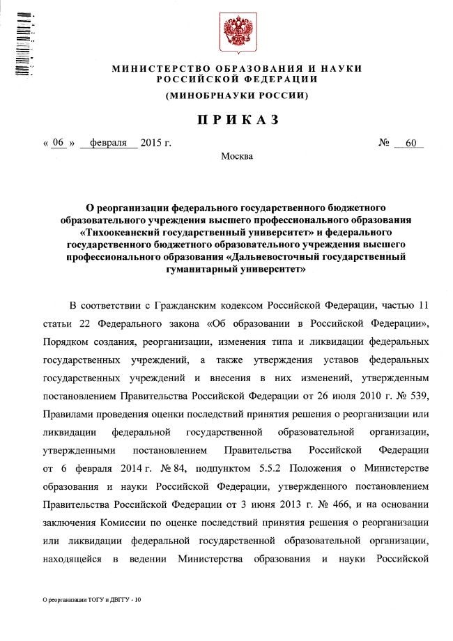 В соответствии с Гражданским кодексом Российской Федерации, частью 11 статьи 22 Федерального закона «Об образовании в Российской Федерации», Порядком создания, реорганизации, изменения типа и ликвидации федеральных государственных учреждений, а также утверждения уставов федеральных государственных учреждений и внесения в них изменений, утвержденным постановлением Правительства Российской Федерации от 26 июля 2010 г. №539, Правилами проведения оценки последствий принятия решения о реорганизации или ликвидации федеральной государственной образовательной организации, утвержденными постановлением Правительства Российской Федерации от 6 февраля 2014 г. № 84, подпунктом 5.5.2 Положения о Министерстве образования и науки Российской Федерации, утвержденного постановлением Правительства Российской Федерации от 3 июня 2013 г. № 466, и на основании заключения Комиссии по оценке последствий принятия решения о реорганизации или ликвидации федеральной государственной образовательной организации, находящейся в ведении Министерства образования и науки Российской Федерации, от 4 февраля 2015 г. №9