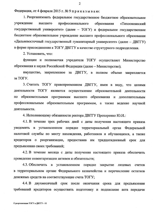 1. Реорганизовать федеральное государственное бюджетное образовательное учреждение высшего профессионального образования «Тихоокеанский государственный университет» (далее - ТОГУ) и федеральное государственное бюджетное образовательное учреждение высшего профессионального образования «Дальневосточный государственный гуманитарный университет» (далее - ДВГГУ) в форме присоединения к ТОГУ ДВГГУ в качестве структурного подразделения.