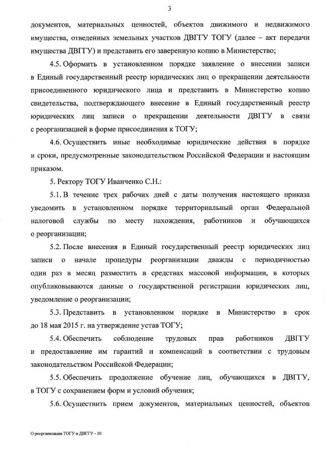 8. Установить, что общий срок проведения реорганизационных мероприятий и представления документов, подтверждающих реорганизацию ТОГУ и ДВГГУ и исключение из Единого государственного реестра юридических лиц присоединенного юридического лица, не может превышать одного года с даты издания настоящего приказа.