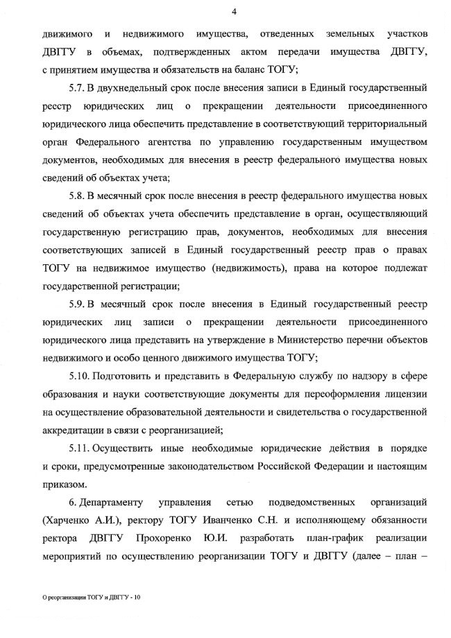 5.6. Осуществить прием документов, материальных ценностей, объектов движимого и недвижимого имущества, отведенных земельных участков ДВПГУ в объемах, подтвержденных актом передачи имущества ДВГГУ, с принятием имущества и обязательств на баланс ТОГУ;