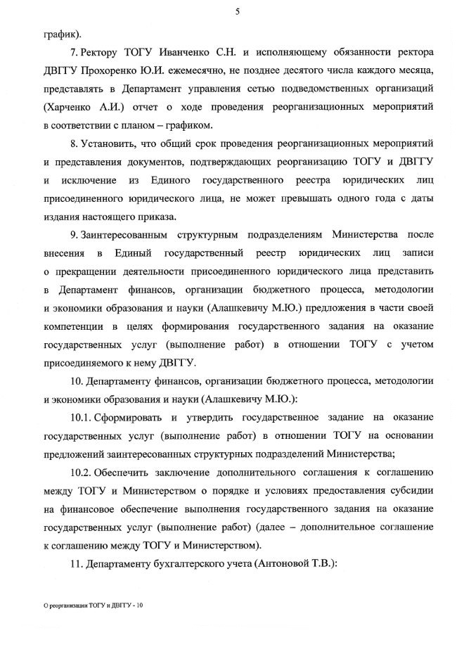 7. Ректору ТОГУ Иванченко С.Н. и исполняющему обязанности ректора ДВГГУ Прохоренко Ю.И. ежемесячно, не позднее десятого числа каждого месяца, представлять в Департамент управления сетью подведомственных организаций (Харченко А.И.) отчет о ходе проведения реорганизационных мероприятий в соответствии с планом - графиком.