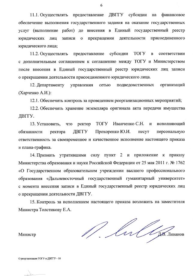 13. Установить, что ректор ТОГУ Иванченко С.Н. и исполняющий обязанности ректора ДВГГУ Прохоренко Ю.И. несут персональную ответственность за своевременное и качественное исполнение настоящего приказа и плана-графика.