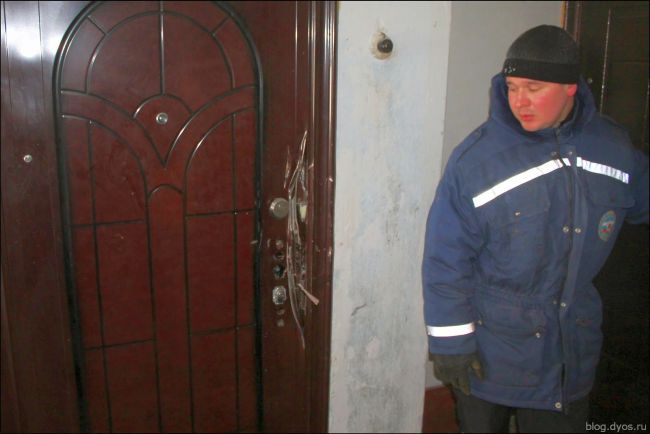| Входная дверь соседней квартиры была порублена топором или ломом в районе замка |