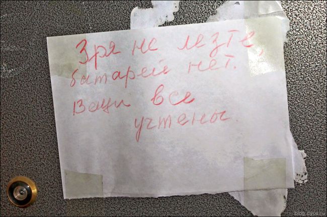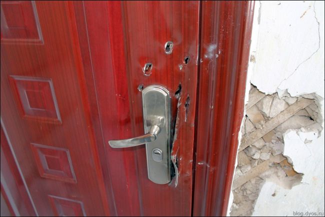 Парень объяснил нам, что в Уссурийском по ночам орудуют мародеры и тащат всё. Входная дверь соседней квартиры была порублена топором или ломом в районе замка. Такая же картина была и на многих других дверях. Выламывают! К слову, многие квартиры внутри были с очень хорошим ремонтом, сначала это всё затопило, а теперь это всё брошено и растаскивается второй группе - мародерами.