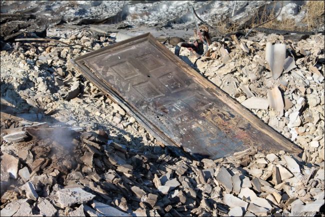 Обойдя дом с другой стороны, мы увидели дымящуюся золу, это был некогда двухэтажный дом с адресом: ул. Насыпная, д. 13. Он горел уже пятый день, точнее - догорал.