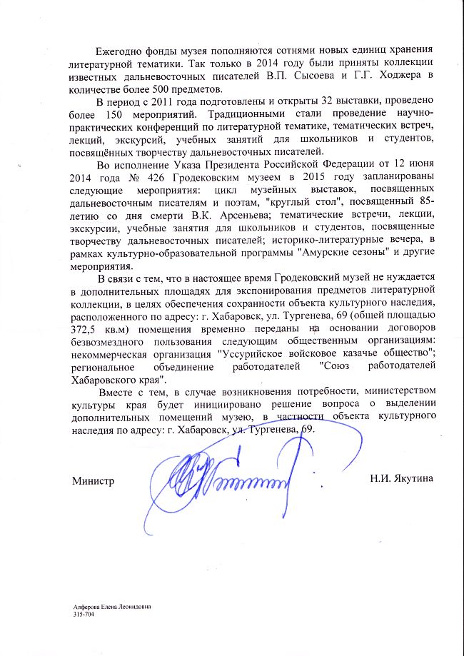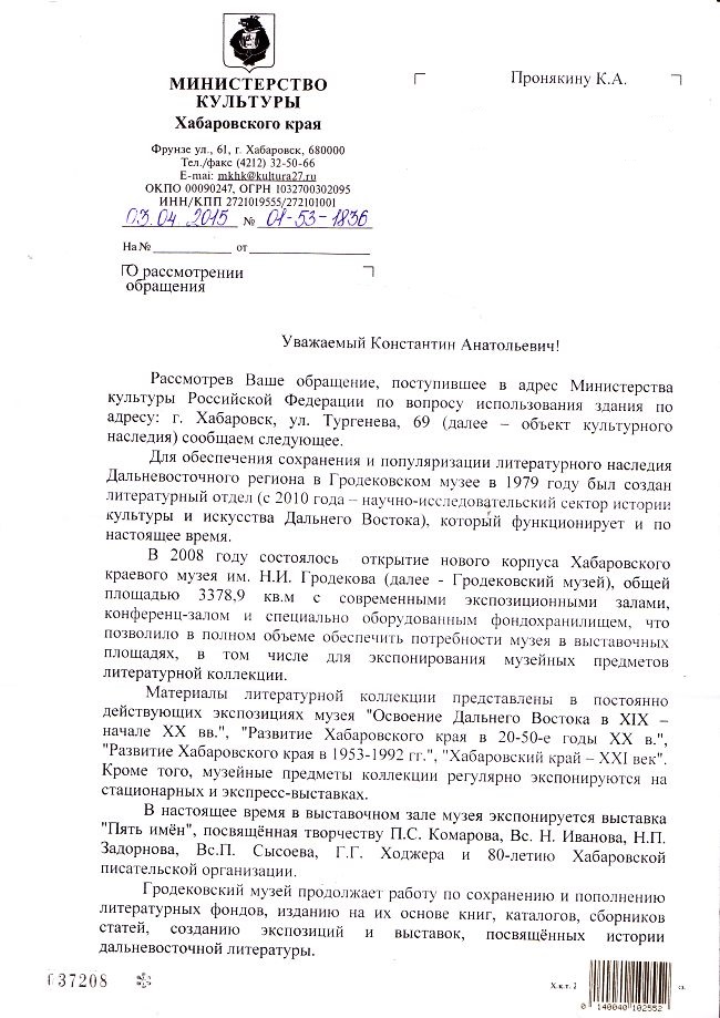 В письме сообщается, что «в настоящее время Гродековский музей не нуждается в дополнительных площадях для экспонирования предметов литературной коллекции». А здание в Хабаровске по ул. Тургенева, 69 (общей площадью 372,5 кв.м) «временно передано на основании договоров безвозмездного [!] пользования общественным организациям: некоммерческой организации «Уссурийское войсковое казачье общество» и региональному объединению работодателей «Союз работодателей Хабаровского края»...»