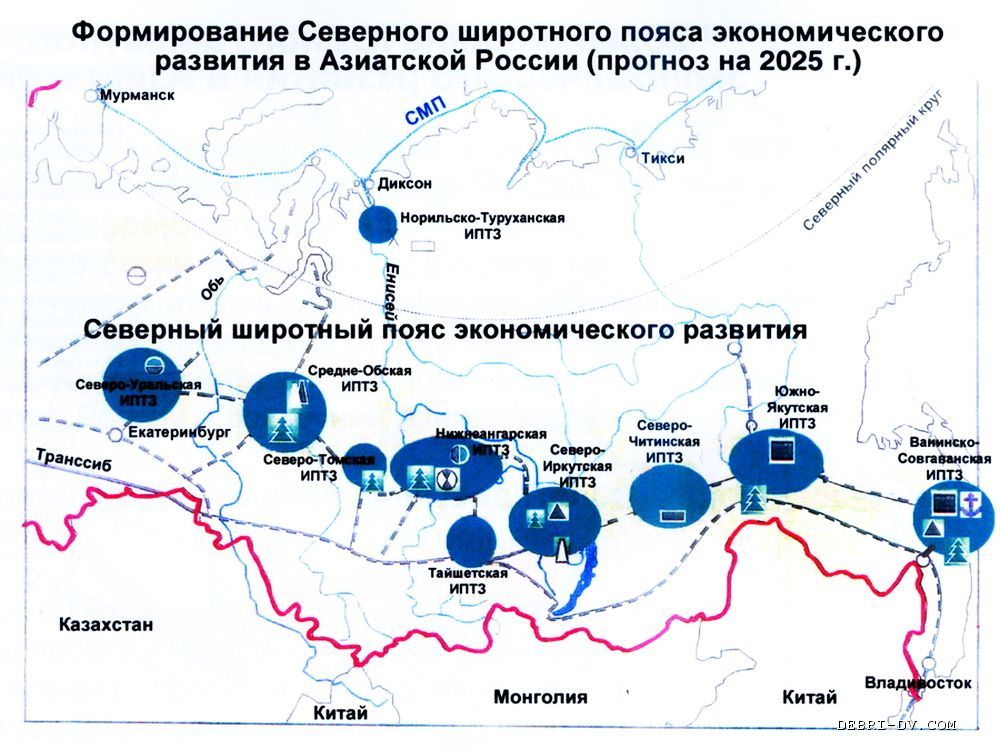 Первый из них: южный широтный пояс экономического развития, который идет вдоль Транссибирской магистрали. Здесь наряду с крупнейшими городами сосредоточены центры обрабатывающей промышленности. Формирование и развитие второго пояса - северного широтного экономического пояса, возможно посредством создания в нем производственно-транспортных (инфраструктурных) зон (ИПТЗ). Формирование этого пояса должно опираться на сырьевые ресурсы.