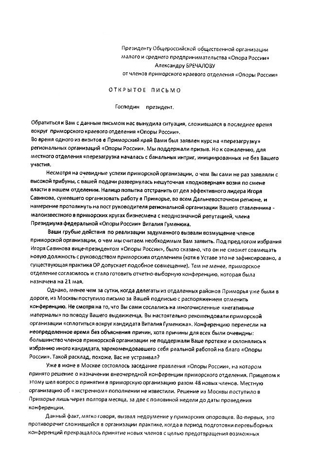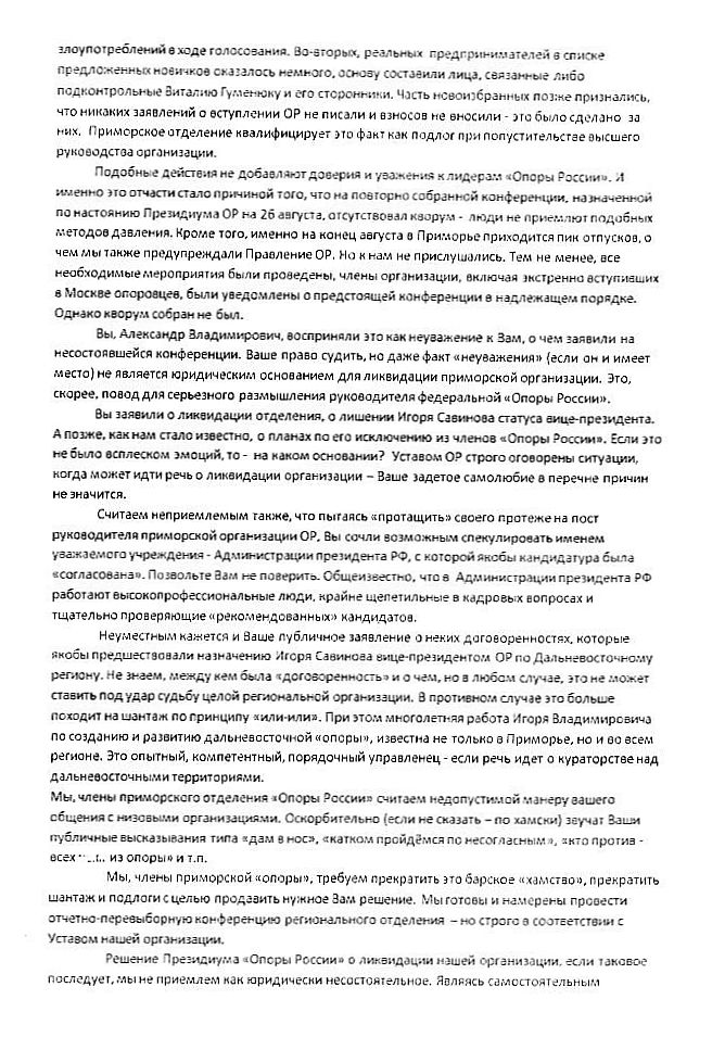 Ваши грубые действия по реализации задуманного вызвали возмущение членов приморской организации, о чем мы считаем необходимым Вам заявить. Под предлогом избрания Игоря Савинова вице-президентом «Опоры России», было сказано, что он не сможет совмещать новую должность с руководством приморским отделением (хотя в Уставе это не зафиксировано, а существующая практика ОР допускает подобное совмещение). Тем не менее, приморское отделение согласилось и стало готовить отчетно-выборную конференцию, которая была назначена на 21 мая.