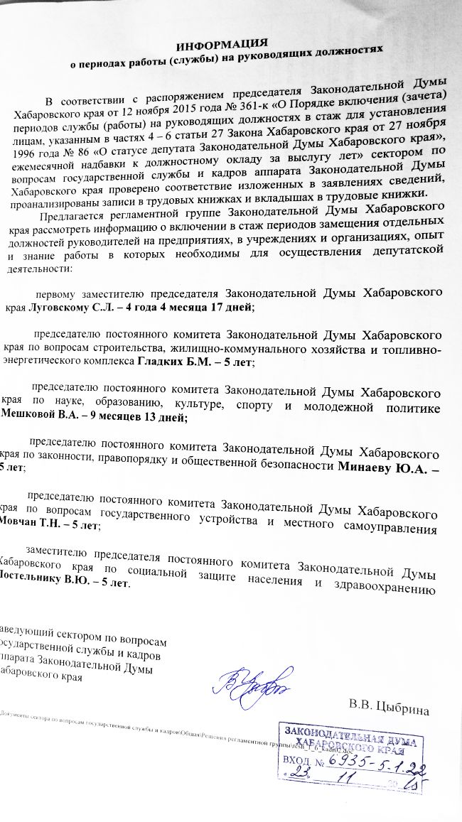 - В законе «О статусе депутата Законодательной думы Хабаровского края», который был принят ещё 27 ноября 1996 года, предусматривались ежемесячные надбавки депутатам, работающим на постоянной основе, за работу на государственной гражданской и муниципальной службе. Естественно, в 1996 году ни Постникова, ни меня в краевой думе не было.