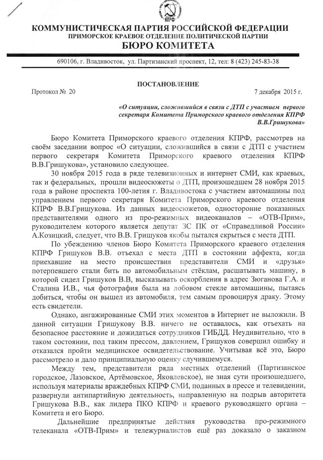 Бюро Комитета Приморского краевого отделения КПРФ, рассмотрев на своём заседании вопрос «О ситуации, сложившийся в связи с ДТП с участием первого секретаря Комитета Приморского краевого отделения КПРФ В.В. Гришукова», установило следующее.