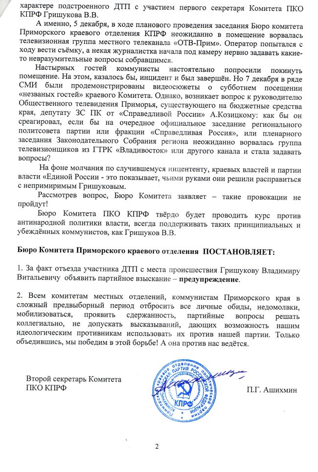 Между тем, представители ряда местных отделений (Партизанское городское, Лазовское, Артёмовское, Яковлевское), не зная сути произошедшего, используя материалы враждебных КПРФ СМИ, поданных в прессе и телевидении, развернули антипартийную деятельность, направленную на подрыв авторитета Гришукова В.В., как лидера ПКО КПРФ и краевого руководящего органа - Комитета и его Бюро.