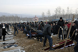Перед отъездом на кладбище родственники и коллеги пронесли все двенадцать гробов, венки и фотографии погибших мимо выстроившихся коридором горожан и еще сотню метров по проспекту Мира, где было также прекращено движение. На городском кладбище судостроителям отвели место рядом с Аллеей почетных граждан, и провожать их в последний путь собралось едва ли меньше людей, чем на площади перед ДК. «На лодке нет работников разных предприятий, есть единый коллектив. И пусть это место станет святым и для заводчан, и для комсомольчан»,— сказал на траурном митинге и.о. гендиректора АСЗ Геннадий Васильев.