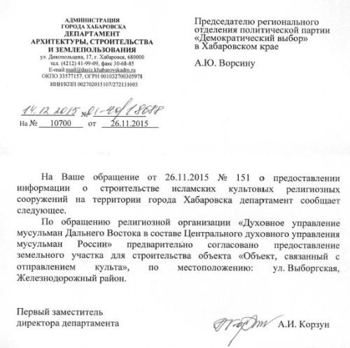 Теперь в этом районе активисты начали сбор подписей под обращением на имя губернатора Хабаровского края Вячеслава Шпорта и мэра Хабаровска Александра Соколова «о приостановке процедуры предоставления земельного участка для мечети до открытого публичного обсуждения настоящего вопроса с учетом всех заинтересованных сторон, в первую очередь жителей района ул. Выборгской».