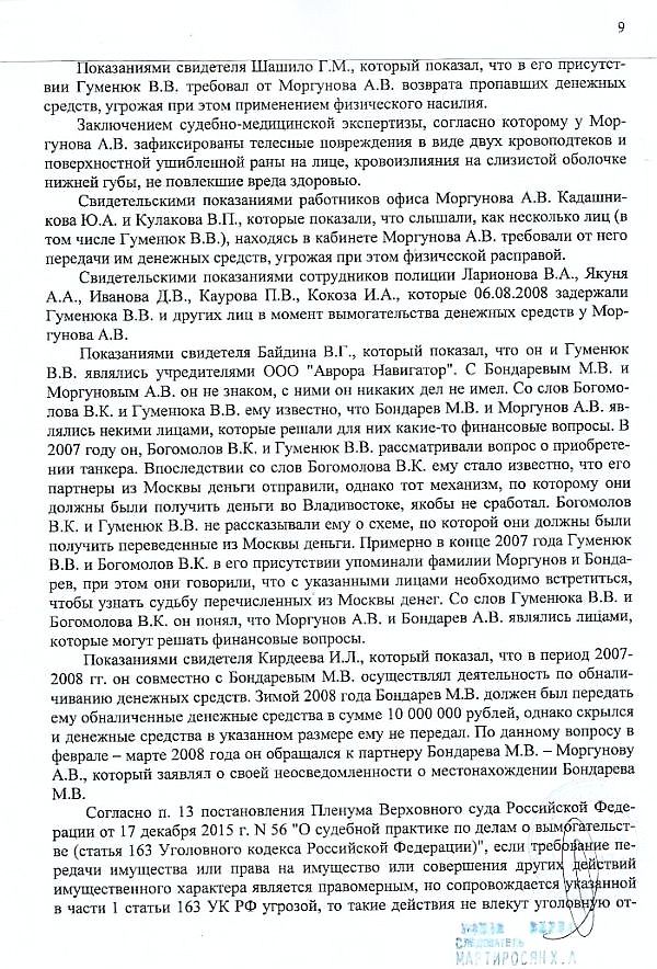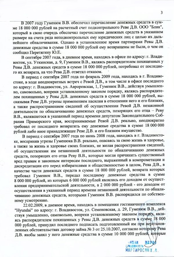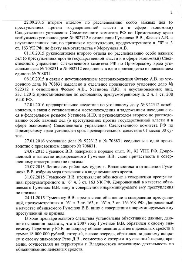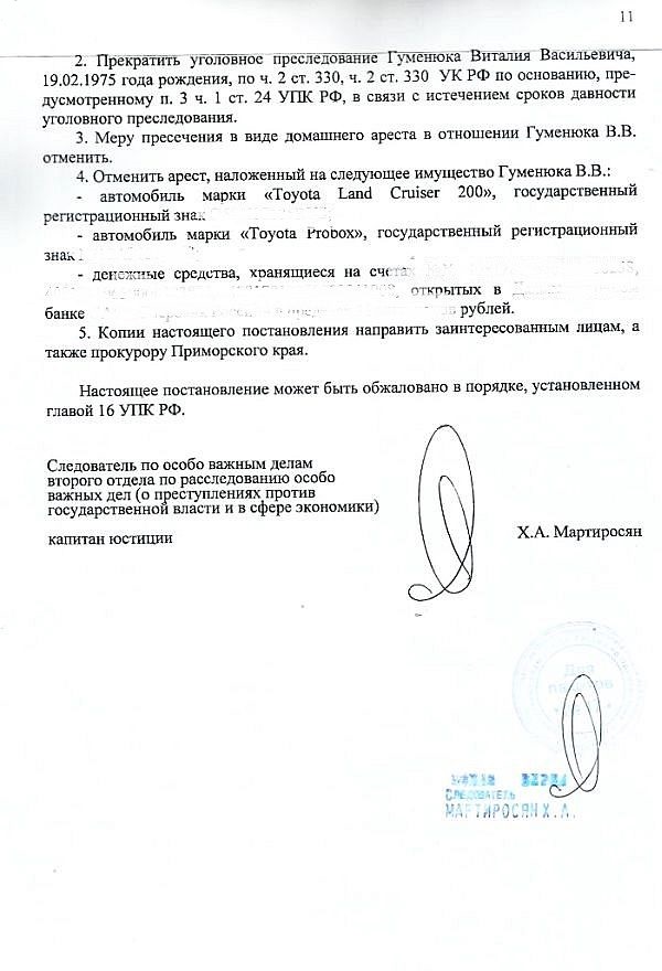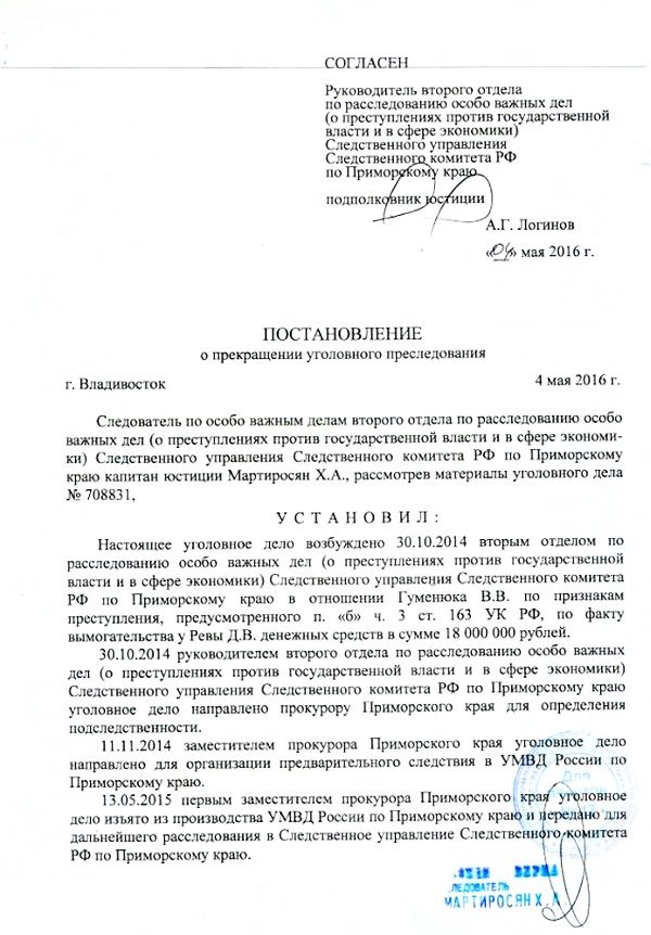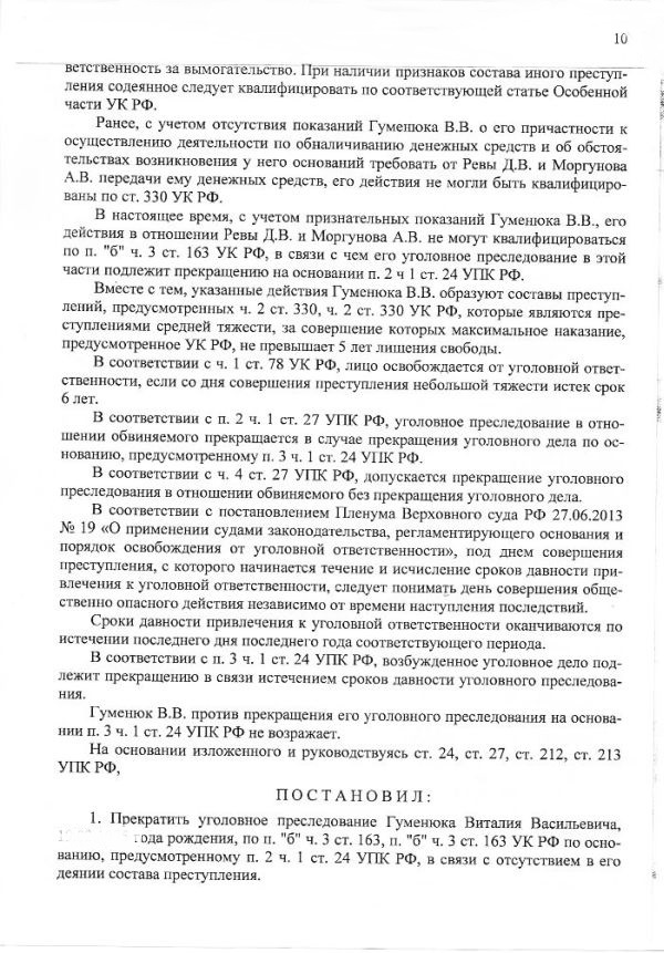 Как сказано в постановлении о прекращении уголовного преследования от 4 мая 2016 года, вынесенном следователем: «Ранее, с учетом отсутствия показаний Гуменюка В. В. о его причастности к осуществлению обналичивания денежных средств... его действия не могли быть квалифицированы по ст. 330 УК РФ. В настоящее время с учетом признательных показаний Гуменюка В. В. <…> его действия не могут квалифицироваться по п. «б» ч. 3 ст. 163 УК РФ, в связи с чем его уголовное преследование в этой части подлежит прекращению…»