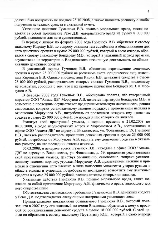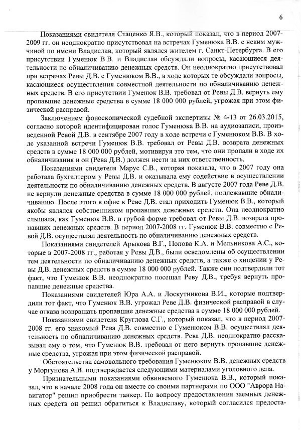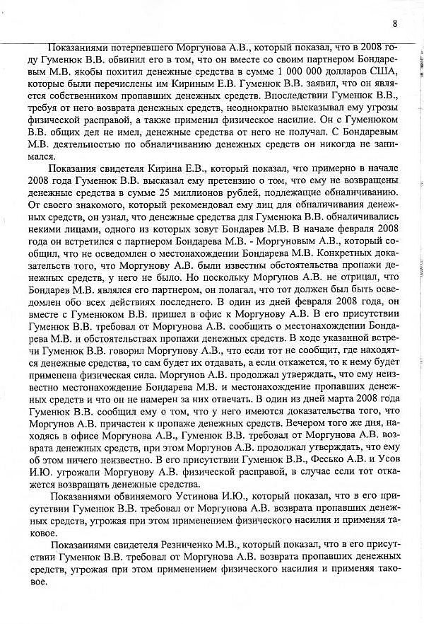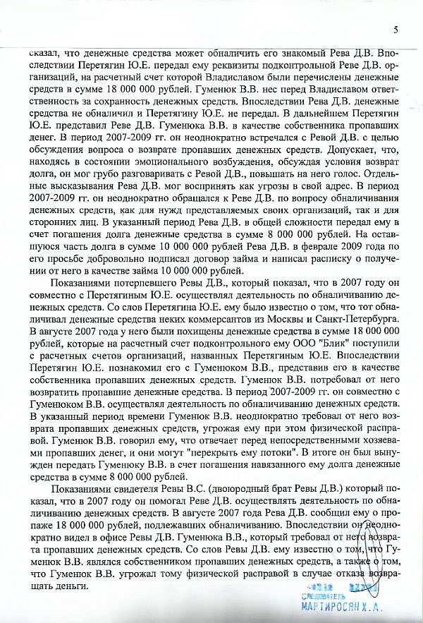 Тем не менее благодаря работе следствия информация про «обналичку» и ее масштабы была получена и закреплена показаниями многих свидетелей и банковскими документами. Когда стало ясно, что Гуменюк требовал у Ревы и Моргунова не принадлежащие ему деньги и перед ним замаячила реальная перспектива надолго оказаться за решеткой, тогда и произошла «переквалификация»: деятельность Виталия Гуменюка с подельниками по «выбиванию» искусственно созданных долгов была представлена как «самоуправные действия», наказание за которые значительно мягче, чем за вымогательство.