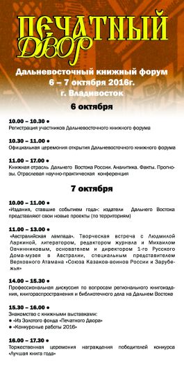 В 2016 году, в преддверии 20-й, юбилейной выставки-ярмарки «Печатный Двор» – 2017, его организаторы провели самый настоящий Форум книжной отрасли Дальнего Востока. Это был форум, посвященный региональному книгоизданию, его истории, проблемам и перспективам.