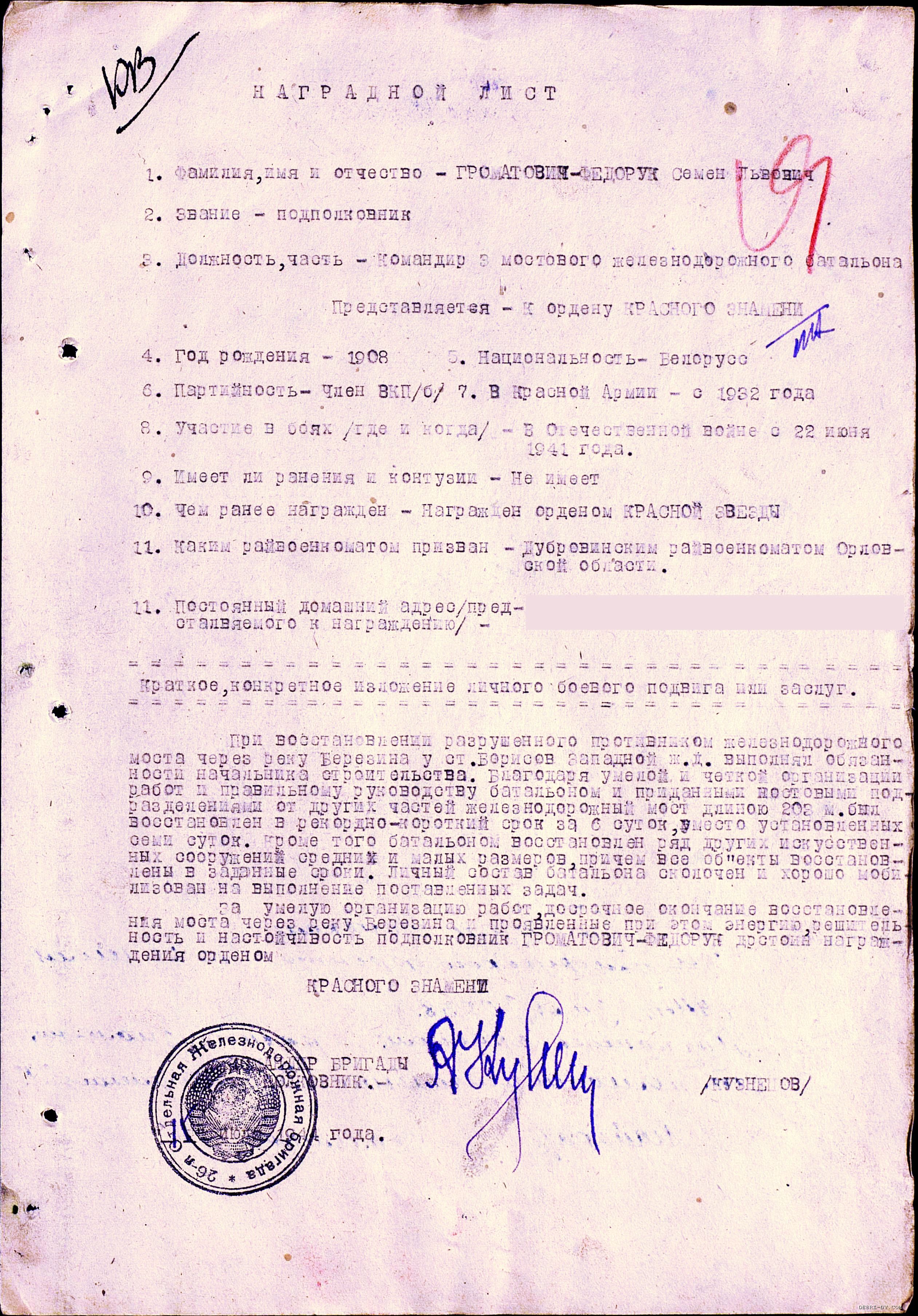 Подполковник Громатович-Федорук Семен Львович (25.09.1908 - 26.12.1952). Родился в Белостокская области Белорусской ССР. В РККА с 1932 года. Призван в армию Дубровским райвоенкоматом (Дубровский район Орловской области). Прошел всю войну, был командиром 3-го мостового железнодорожного батальона 17-й железнодорожной бригады, воевал на 3-м Белорусском фронте. Награжден орденом Красного Знамени (№538 от 26.07.1944 г.). Ранее награжден орденом Красной Звезды.