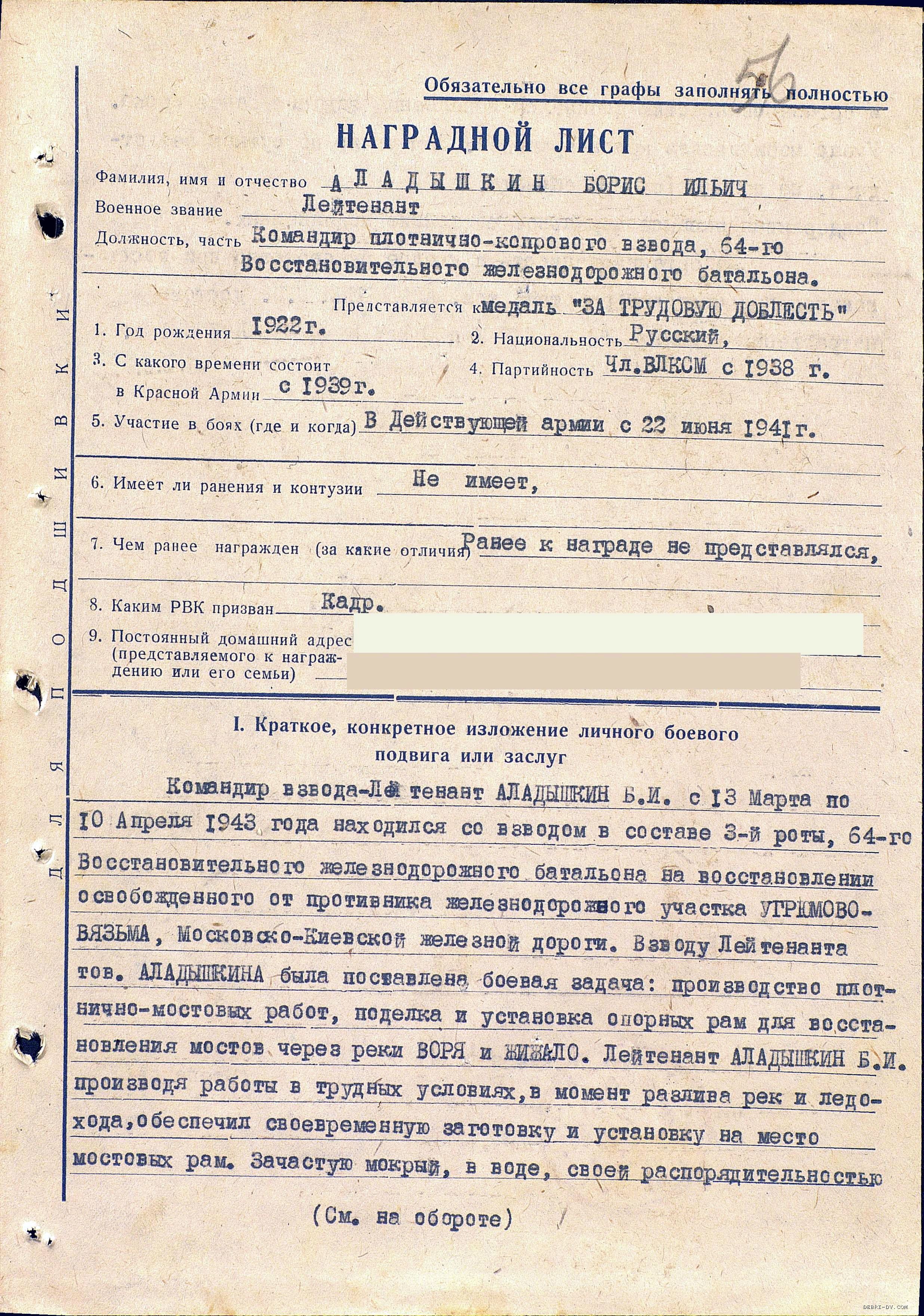 | Наградной лист на Аладышкина Бориса Ильича |