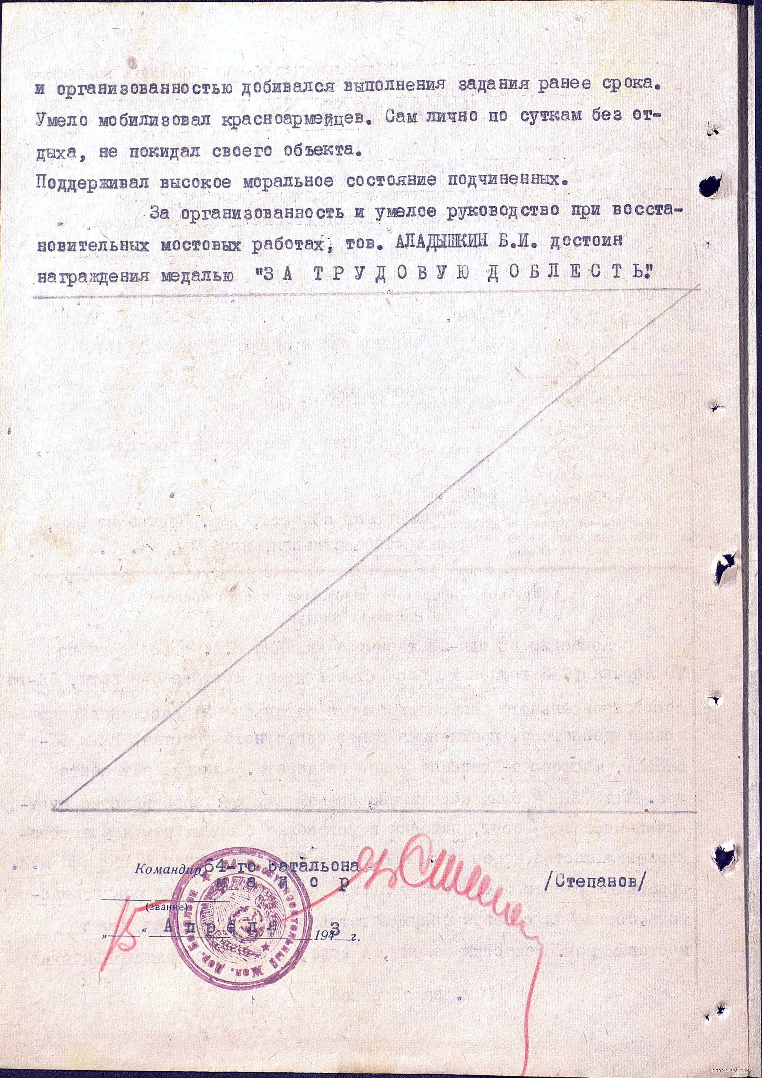Майор Аладышкин Борис Ильич (1922 - 16.10.1952). Родился в г. Павлов-на-Оке Горьковской области. Поступил на службу в 1939 году. Прошел войну, начинал командиром плотнично-копрового (сваебойного) взвода 64-го восстановительного железнодорожного батальона 1-я железнодорожной бригады. Награжден медалью «За боевые заслуги» (№6/н от 25.04.1943 г.). Представлялся к медали «За трудовую доблесть». Все эти данные оцифрованы в ЦАМО (см. Ф.33. Оп.682526. Ед.хр. 1153. № зап. 16808172).