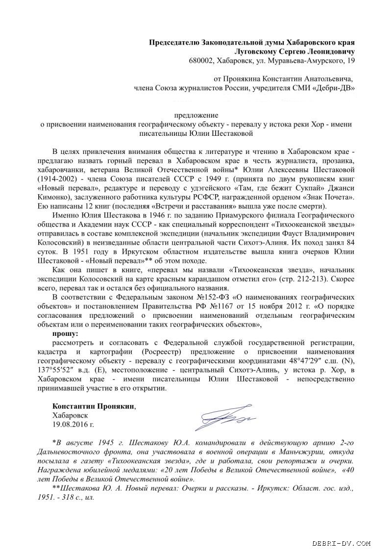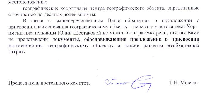 ...И финальные строки: «В связи с вышеперечисленным, обращение о предложении о присвоении наименования географическому объекту - перевалу у истока реки Хор - имени писательницы Юлии Шестаковой не может быть рассмотрено, так как не представлены документы, обосновывающие предложение о присвоении наименования географическому объекту, а также расчеты необходимых затрат». Подпись: Т. Н. Мовчан.