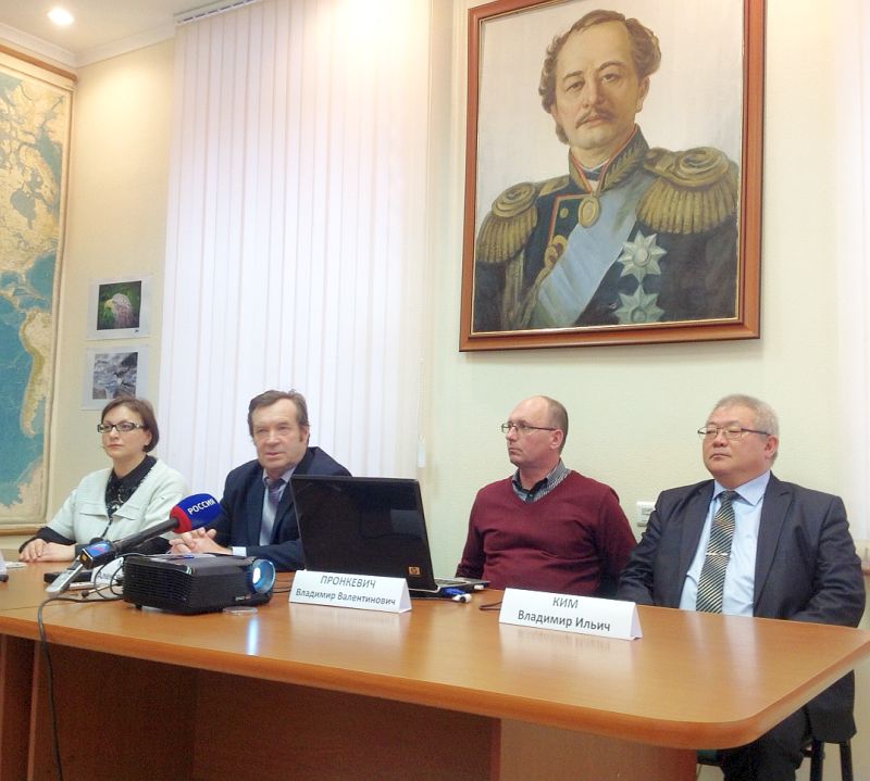 | В Хабаровском краевом отделении Русского географического общества стартовал цикл встреч с учеными общества на актуальные темы: заместитель директора по научной работе ИВЭП ДВО РАН доктор биологических наук Мария Крюкова, председатель Хабаровского краевого отделения Русского географического общества, заместитель директора по научной работе ИВЭП ДВО РАН доктор географических наук Алексей Махинов, старший научный сотрудник ИВЭП ДВО РАН, руководитель экспедиции кандидат биологических наук Владимир Пронкевич и заведующий лабораторией гидрологии и гидрогеологии ИВЭП ДВО РАН кандидат географических наук Владимир Ким (слева направо) |