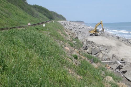 Укрепление береговой полосы по западному побережью в районе 102–105 км перегона Пионеры – Чехов начались также два года назад. В данном месте путь пролегает в непосредственной близости от береговой линии, и агрессивное воздействие моря здесь особенно активно.