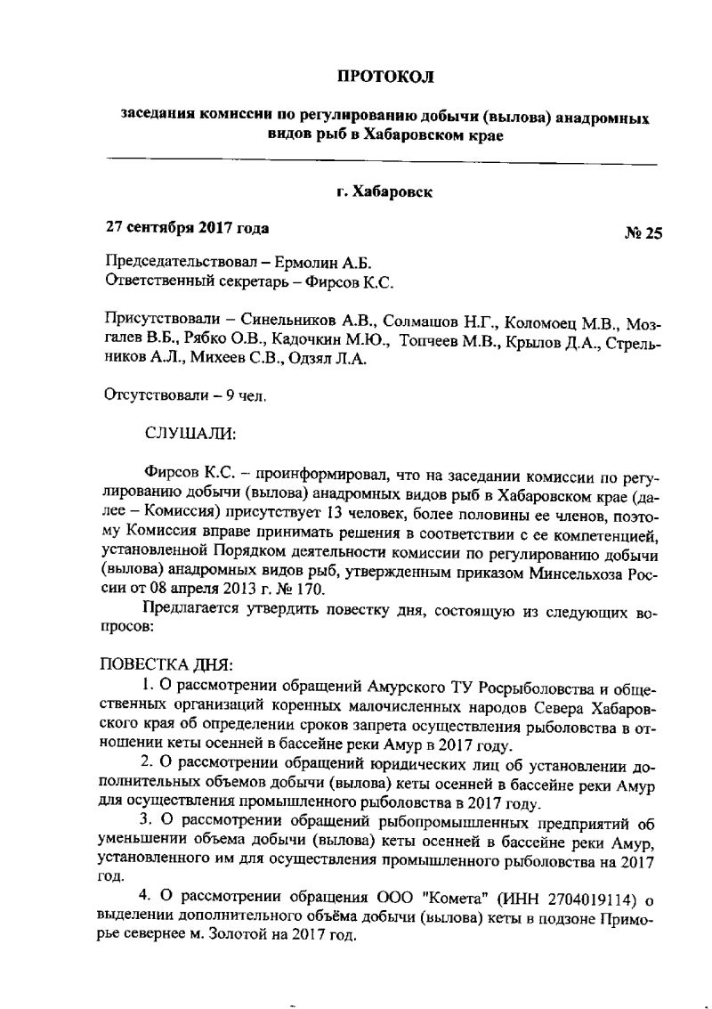| Протокол заседания комиссии по регулированию добычи (вылова) анадромных видов рыб в Хабаровском крае от 27.09.2017 № 25, утвержденный распоряжением Амурского ТУ Росрыболовства от 27.09.2017 № 27/рп |