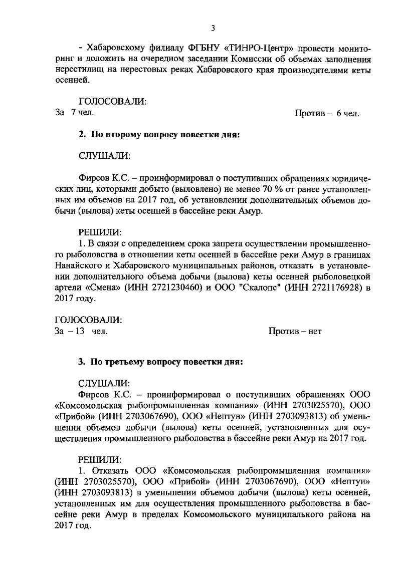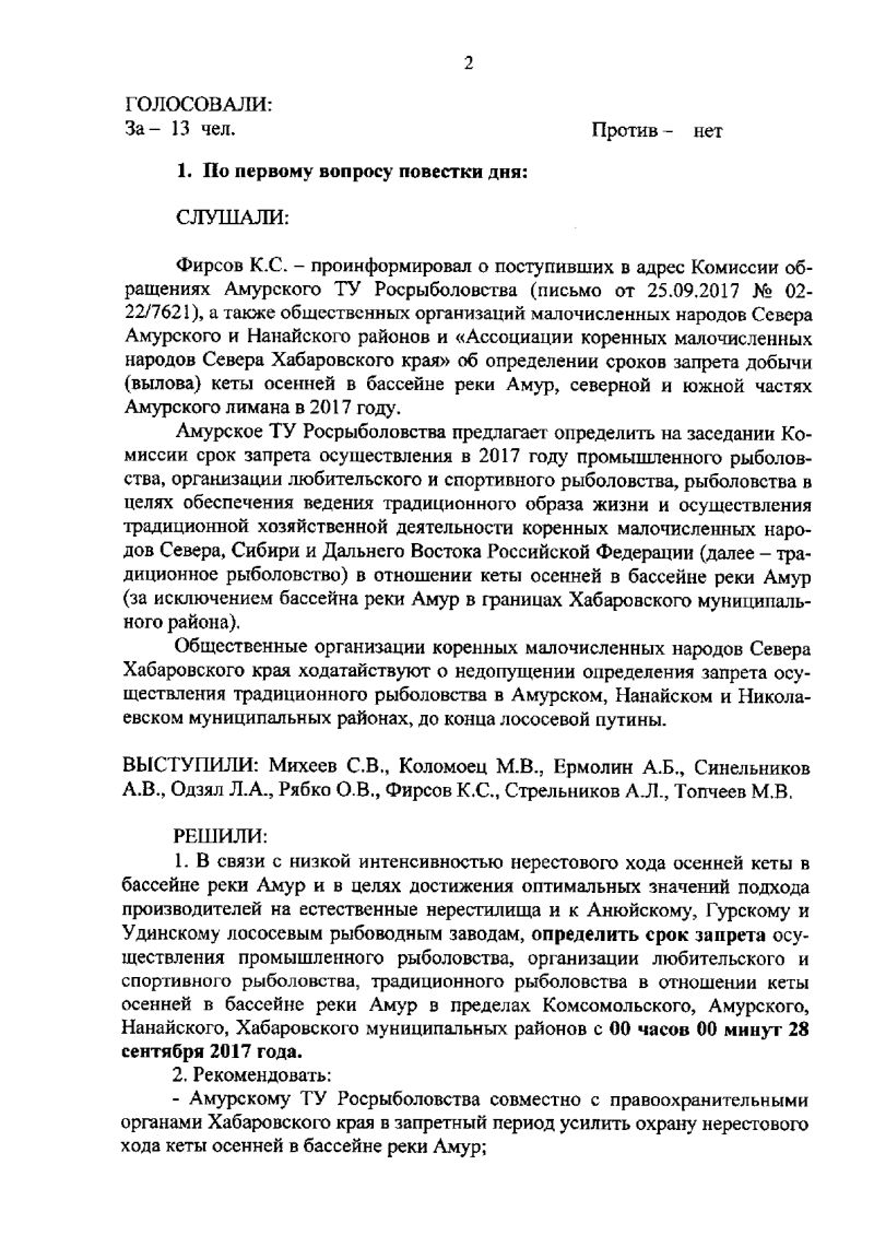 Как указано в решении комиссии, «в связи с низкой интенсивностью нерестового хода осенней кеты в бассейне реки Амур и в целях достижения оптимальных значений подхода производителей на естественные нерестилища и к Анюйскому, Гурскому и Удинскому лососевым рыбоводным заводам, определить срок запрета... рыболовства, в отношении кеты осенней в бассейне реки Амур в пределах Комсомольского, Амурского, Нанайского, Хабаровского муниципальных районов с 28 сентября...»
