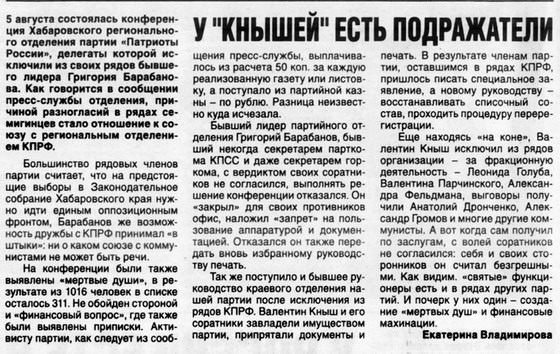 Так же поступило и бывшее руководство краевого отделения нашей партии после исключения из рядов КПРФ. Валентин Кныш и его соратники завладели имуществом партии, припрятали документы и печать. В результате членам партии, оставшимся в рядах КПРФ, пришлось писать специальное заявление, а новому руководству — восстанавливать списочный состав, проходить процедуру перерегистрации.