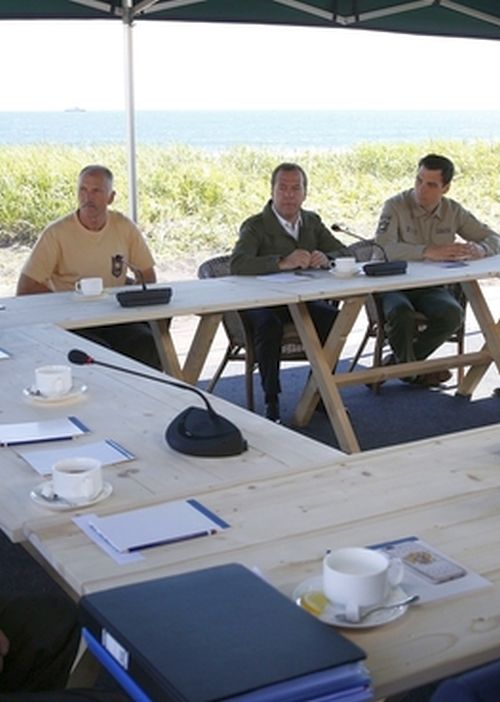 | Встреча с сотрудниками Кроноцкого государственного заповедника. На пляже к приезду премьер-министра разбили небольшой городок - мобильный пункт временного размещения (ПВР). В течение нескольких дней его строили около сотни спасателей МЧС. Им помогали специалисты из других ведомств |