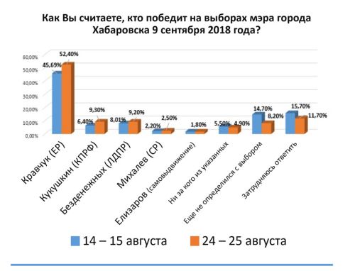 Согласно ч. 2 ст. 46 закону №67-ФЗ сообщается: 1. Организация, проводившая опросы: ООО «Социс» (директор Ярулин (младший) Константин Илдусович). 2. Время их проведения: с 14 по 15 августа 2018 года и с 24 по 25 августа 2018 года. 3. Число опрошенных в каждом опросе (выборка): 600 респондентов. 4. Метод сбора информации: анкетирование, среди граждан старше 18 лет. 5. Регион, где проводился опрос: в Хабаровском крае, на территории г. Хабаровска. 6. Точная формулировка вопроса: задавалось четыре вопроса - «Знаете ли вы, когда пройдут выборы губернатора Хабаровского края и мэра Хабаровска?», «Пойдете ли вы на выборы губернатора Хабаровского края и мэра Хабаровска?», «Как вы считаете, кто победит на выборах мэра Хабаровска 9 сентября 2018 года?» (представлен графически), «Какие СМИ являются основным источником формирования вашего мнения, как избирателя?». 7. Статистическая оценка возможной погрешности: 3,8%. 8. Лицо (лица), заказавшее (заказавшие) проведение опроса и оплатившее (оплатившие) указанную публикацию (обнародование): ООО «Социс». ЭПИ «Дебри-ДВ» публикует на безвозмездной основе.