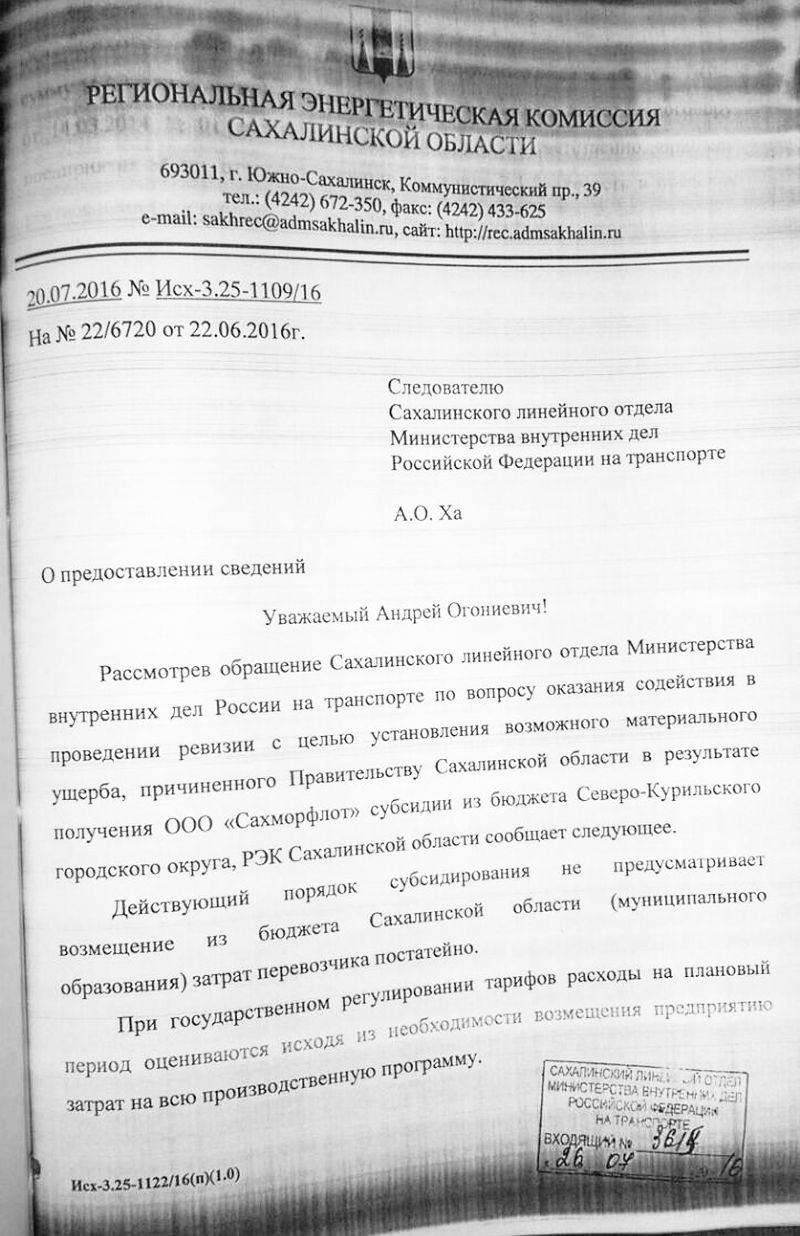 В ответе следователю Сахалинского линейного отдела МВД РФ на транспорте Ха А.О. №Исх-3.25-1109/16 от 20.07.2016 на №22/6720 от 22.06.2016 РЭК Сахалинской области ответил (разъяснил) следующее: