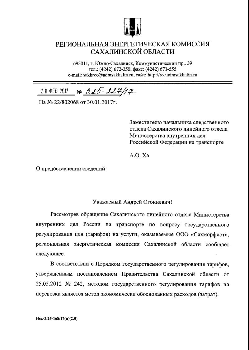 Данные обоснованные ответы были предоставлены Региональной энергетической комиссией Сахалинской области (исх.№3.25-227/17 от 20.02.2017) в ответ на запрос заместителя начальника СО Сахалинского ЛО МВД России на транспорте майором юстиции Ха А.О. (запрос исх.№22/802068 от 30.01.2017 года), однако и запрос следователя Ха А.О. и ответ РЭК Сахалинской области на запрос отсутствуют в материалах уголовного дела.