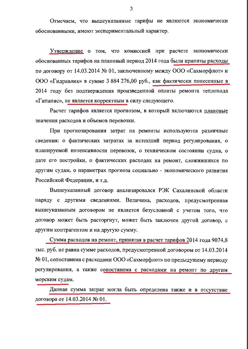 Данный вопрос находится в ведении РЭК Сахалинской области (письмо №1469 от 09.09.2016, №971 от 11.08.2017). А РЭК Сахалинской области прямо говорит о том, что Договор №01 на ремонт судна т/х Гипанис от 14.03.2014 года анализировался РЭК Сахалинской области наряду с другими сведениями (письмо исх.№3.25-227/17 от 20.02.2017).