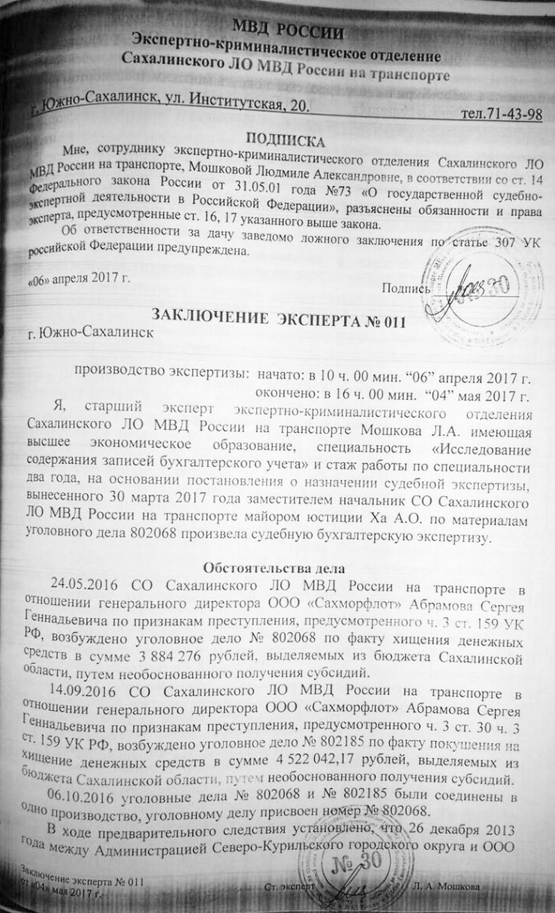 Экспертиза была проведена старшим экспертом экспертно- криминалистического отдела Сахалинского ЛО МВД России на транспорте Мошковой Л.А. имеющей высшее экономическое образование, специальность: «Исследование содержание записей бухгалтерского учета» (стаж работы по специальности 2 года).