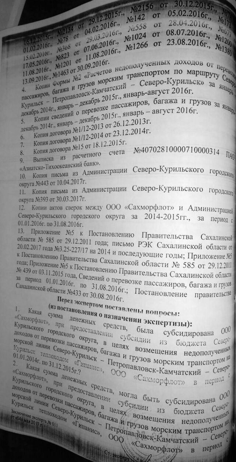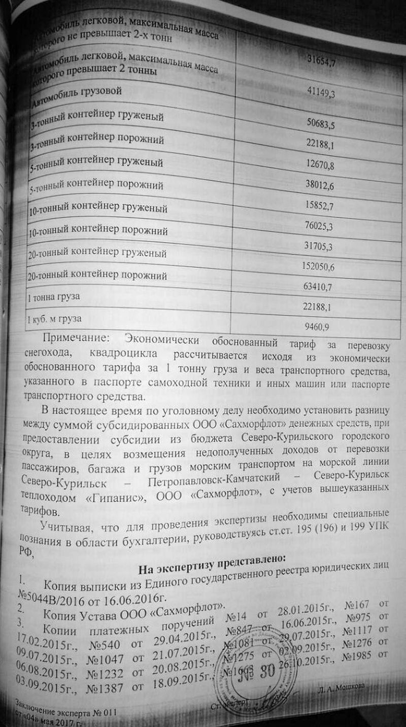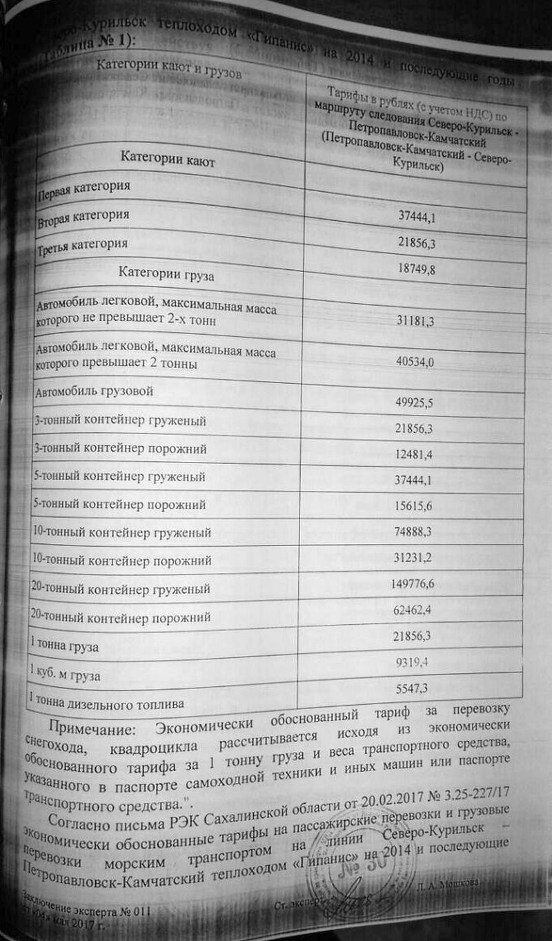 В заключении эксперта №011 от 06.04.2017 года, применена таблица №2 на стр. 4, а в последнем абзаце на стр. 3 указано: « Согласно письма РЭК Сахалинской области от 20.02.2017 №3.25-227/17 экономически обоснованные тарифы на пассажирские перевозки и грузовые перевозки морским транспортом на линии Северо-Курильск - Петропавловск-Камчатский теплоходом «Гипанис» на 2014 и последующие годы, при условии исключения из ИТОГОВОЙ СУММЫ 3 884 276 рублей по ремонту т/х «Гипанис». Однако в разделе «На экспертизу представлено» (стр. 7 и стр. 8 заключения эксперта №011 от 06.04.2017 года) среди перечисленных документов нет письма РЭК Сахалинской области от 20.02.2017 №3.25-227/17, нет данного письма РЭК Сахалинской области и в материалах уголовного дела №802068.