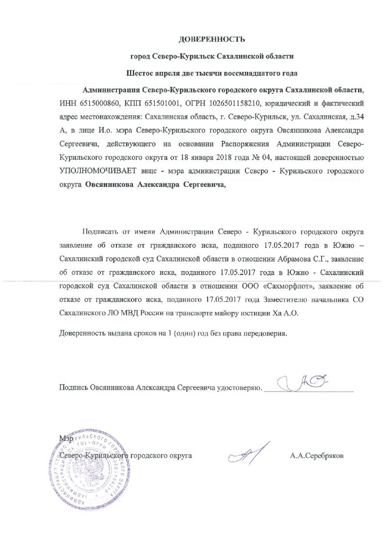 В ответе следователю Сахалинского линейного отдела МВД РФ на транспорте Ха А.О. №1469 от 09.09.2016 на №2/9393 от 30.08.2016 от Администрации Северо-Курильского городского округа (подписанном мэром Серебряковым А.А.), имеющемся в материалах УД №802068 копию прилагаю сказано, что: