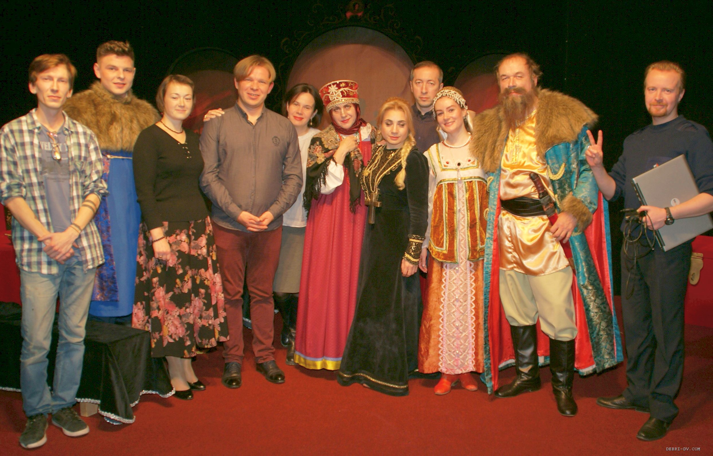 | Андрей Цветков-Толбин и Мария Леонова с артистами и творческой группой спектакля «Боярыня Вера Шелога». |