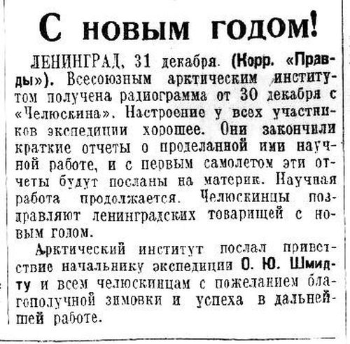 31 декабря челюскинцы собрались в кают-компании, на праздничном столе выставили банки с тушенкой, разливали спирт. Всем запомнился тост, который произнес старенький судовой механик: «Да здравствует социализм и расточатся враги его!» (это как из Библии: «Да восстанет Бог, и расточатся враги Его», Псалтирь. Псалом 67:2-4).