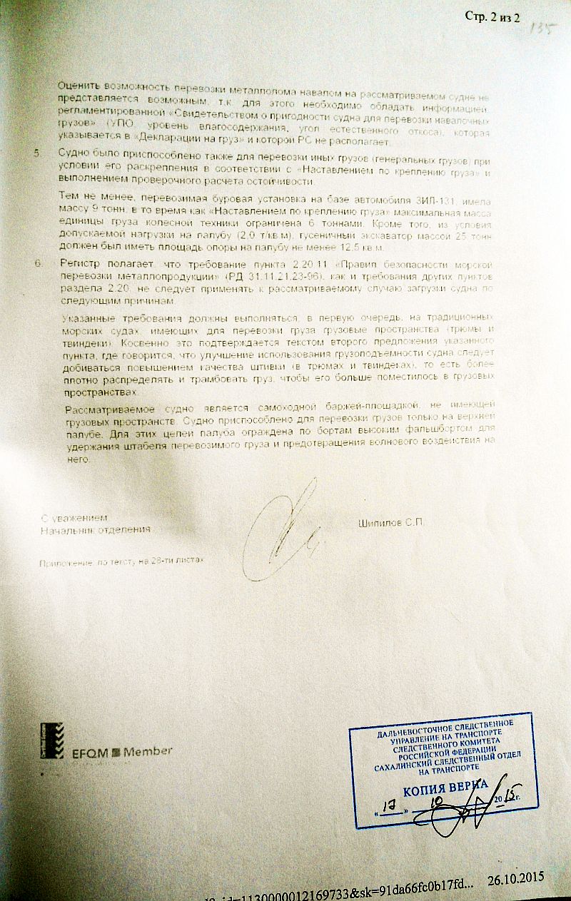 Ниже фотография письма №284135 от 23.10.2015 ФАУ Российский морской регистр судоходства (л.д. 134-135 Т.1) из материалов уголовного дела: