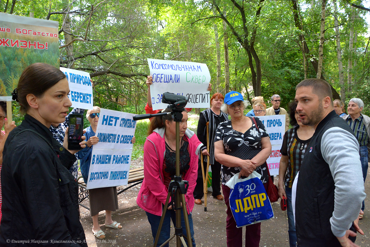 Перепалка между «алкогольным королём» и возмущёнными жителями продолжалась минут 20… Горожане утверждали, что паспорт объекта застройщик повесил только перед самым митингом. Однако, его представитель, пришедший на митинг, пытался утверждать, что паспорт они уже два или три раза вешали, но его, дескать, кто-то срывал. Есть подозрение, что он вводит горожан в заблуждение, потому что они уже целый год денно и нощно наблюдают за сквером и веры им больше, чем «застройщику». В итоге, не выдержав напора разъярённых людей, он поспешил удалиться.