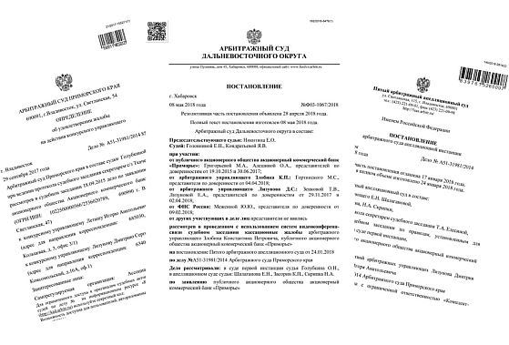 …Последний арбитражный процесс по этому делу в суде Приморского края - в чистом времени - продолжался недолго. Несколько коротких заседаний - и на минувшей неделе судья Бойко вынесла решение: да, признать Лизунова и Леташа виновными и взыскать с них солидарно 21 миллион рублей, ходатайство защиты о привлечении Злобина (на чем прямо настаивает более высокая арбитражная инстанция), как и многие другие ходатайства, отклонить.
