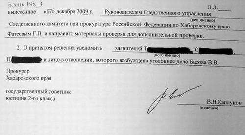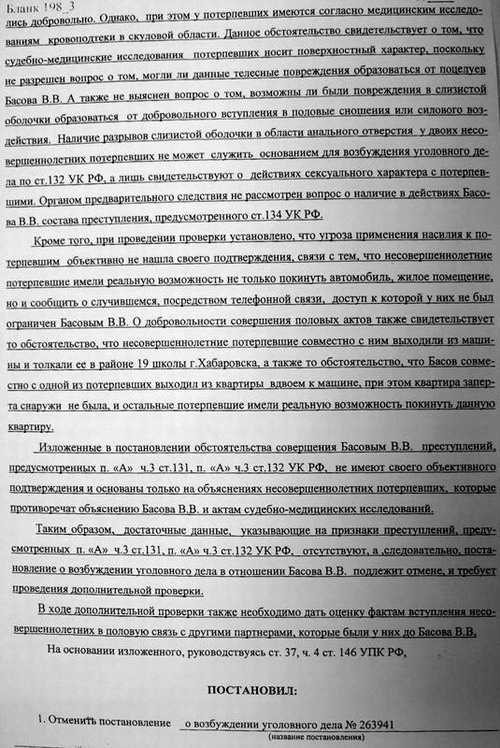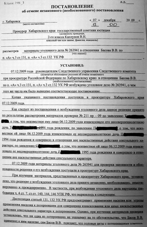 Прокурор Хабаровского края Виталий Каплунов: «…Наличие разрывов слизистой оболочки в области анального отверстия у двоих несовершеннолетних потерпевших не может служить основанием для возбуждения уголовного дела по ст. 132 УК РФ, а лишь свидетельствует о действиях сексуального характера с потерпевшими…» ДЕЛО ЭКС-ПРОКУРОРА БАСОВА- документы