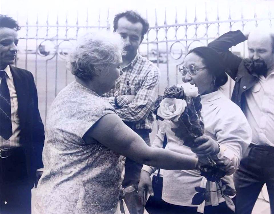 | Это фото сделано Ильдаром Шагаутдиновым после возвращения Евдокии Александровны Гаер со съезда Верховного Совета СССР, на котором она с высокой трибуны, в прямом и переносном смысле, на весь мир громко сказала о катастрофическом положении малых народов Севера. На встрече в аэропорту отец и сын Мирмовичи, доверенные лица Гаер А.Я. Казанцева и Ю.В. Ефименко. |