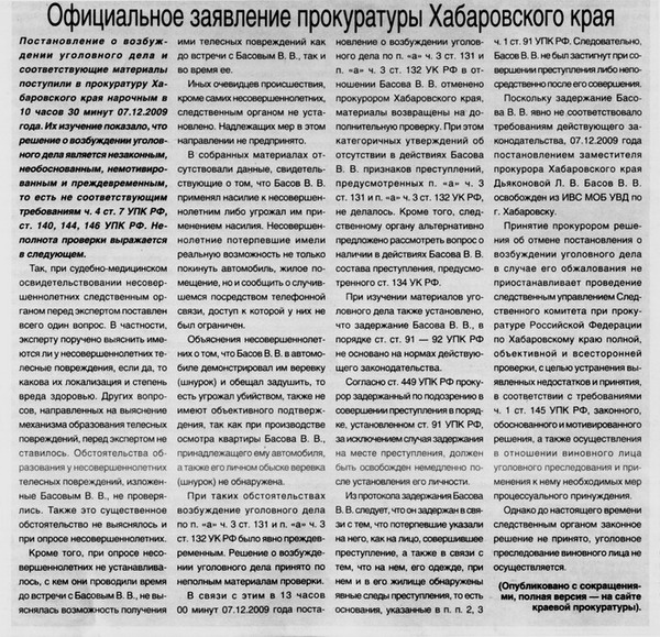 Поскольку задержание Басова В. В. явно не соответствовало требованиям действующего законодательства, 07.12.2009 года постановлением заместителя прокурора Хабаровского края Дьяконовой Л. В. Басов В. В. освобожден из ИВС МОБ УВД по г. Хабаровску.