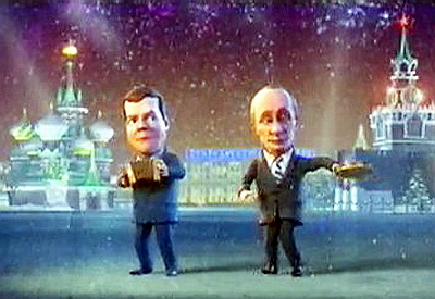 «Первый канал» в новогоднем эфире показал компьютерный мультфильм, персонажами которого стали показанные в карикатурном виде президент Медведев и премьер-министр Путин.