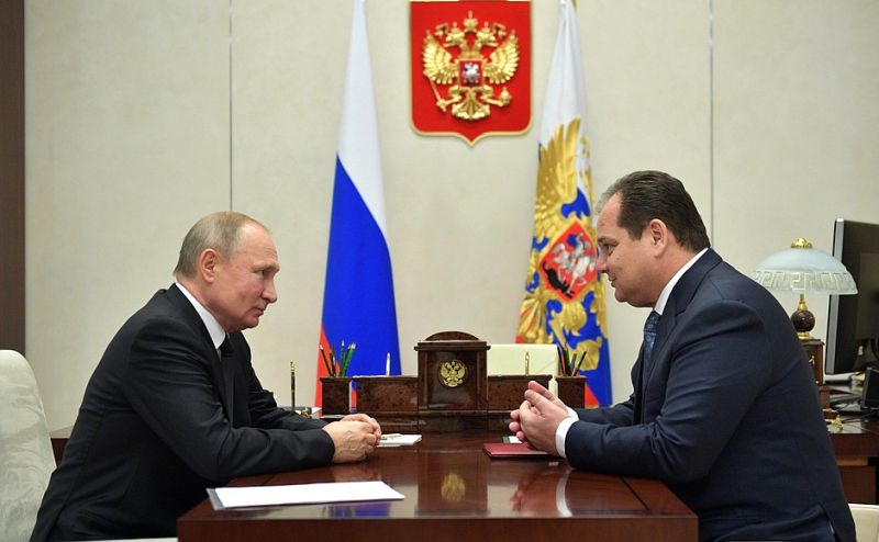 | Владимир Путин с Ростиславом Гольдштейном, назначенным врио губернатора Еврейской автономной области. |