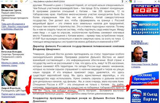 «Отделять Россию от Востока - диковато. Большая часть нашей страны находится в Азии. На юге от вас, за великой рекой находится величайшее государство мира, которое сегодня демонстрирует потрясающие темпы развития. Возможна ли модернизация без демократии? Если взглянуть на Китай, то все станет ясно. Экономика Китая – это не внешняя торговля. Внешняя торговля там определяется Генеральным штабом Народно-освободительной армии. Вы здесь, на Дальнем Востоке лучше видите, как выстраивать отношения с соседним государством. Насколько это перспектива для России, или угроза?