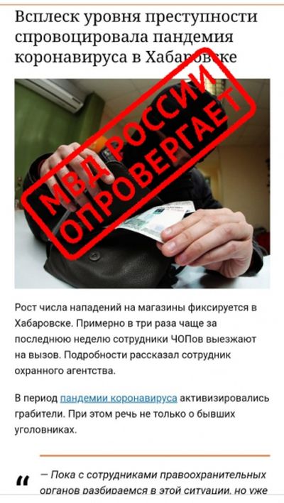 В результате проведенной проверки установлено, что опубликованные данные являются недостоверными. Согласно статистики, с начала 2020 года в Хабаровске зарегистрировано на 300 преступлений меньше, чем в аналогичном периоде прошлого года. Отмечается тенденция к снижению количества краж и грабежей. С начала введения в регионе режима повышенной готовности на территории Хабаровска отмечено сокращение на 230 преступлений, в сравнении с аналогичной статистикой 2019 года.