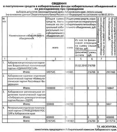 Сведения о поступлении средств в избирательные фонды избирательных объединений и их расходовании при проведении выборов депутатов Законодательной думы Хабаровского края пятого созыва (на основании данных Сберегательного банка Российской Федерации) по состоянию на 08.02.2010 г.